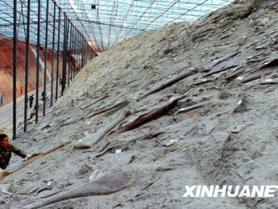 10月20日,科考人员在新近发掘的500米长的化石长廊清理保护恐龙化石。 这是已...