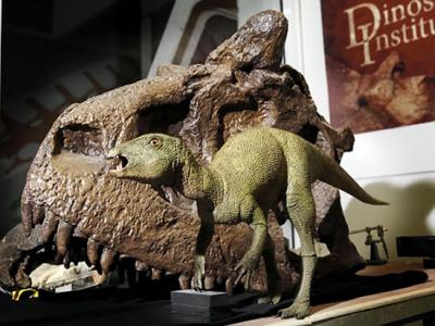 Fruitadens haagarorum模型,这是北美发现的最小恐龙,旁边是一个食肉牛龙头骨。...