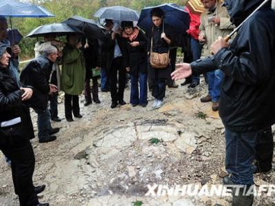 10月8日,在法国东南部城市里昂附近的普拉涅,人们观看“恐龙足迹”。 10月8日...
