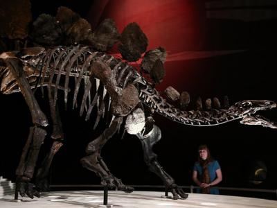 伦敦自然历史博物馆研究剑龙化石。团队出土多块剑龙椎骨和一块前臂骨。剑龙因独特外...