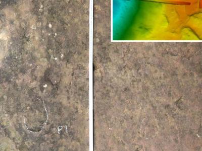 “李存孝打虎处”的“虎爪印”和“人足迹”,右上角为三维成像的“虎爪印”(摄影/...