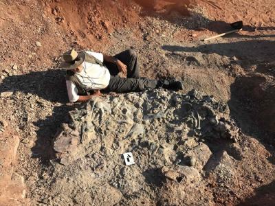 考古学家马丁内斯躺在其中一副恐龙化石旁拍照留念。“恐龙墓地...