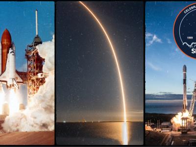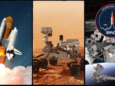 在三张幻灯片中展示了25年的太空飞行,其中包括航天飞机、火星车和太空探索技术公司...