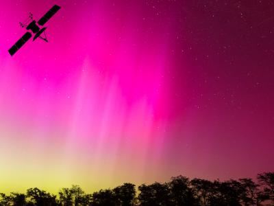 一张渲染图,显示了一颗卫星在彩色极光中的轮廓。(图片来源:Anton Petrus/Getty ...