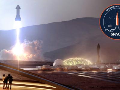 艺术家对火星上人类定居点的插图,背景为SpaceX星际飞船。(图片来源:SpaceX,徽标...