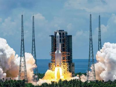 中国长征五号B遥二运载火箭搭载空间站天和核心舱在海南文昌航天发射场发射升空(蜘...