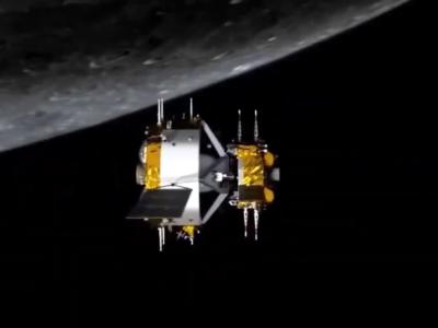 嫦娥六号轨道飞行器和上升器在月球物质转移完成时的模拟图像。(图片来源:CNSA)(...