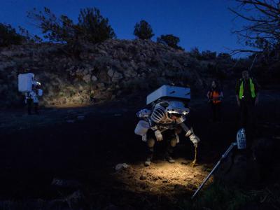晚上,一名身穿白色装备的宇航员在土壤中放置一个样本标记。她面前的泥土被打开的头...