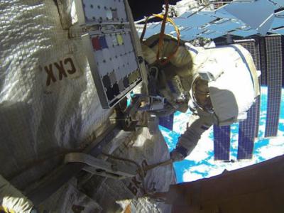 国际空间站俄罗斯宇航员在开放太空工作期间拿走飘在空间站外面...