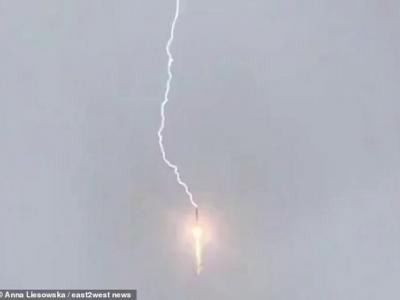 俄罗斯联盟号2-1b运载火箭发射升空时被闪电击中视频:俄罗斯联...