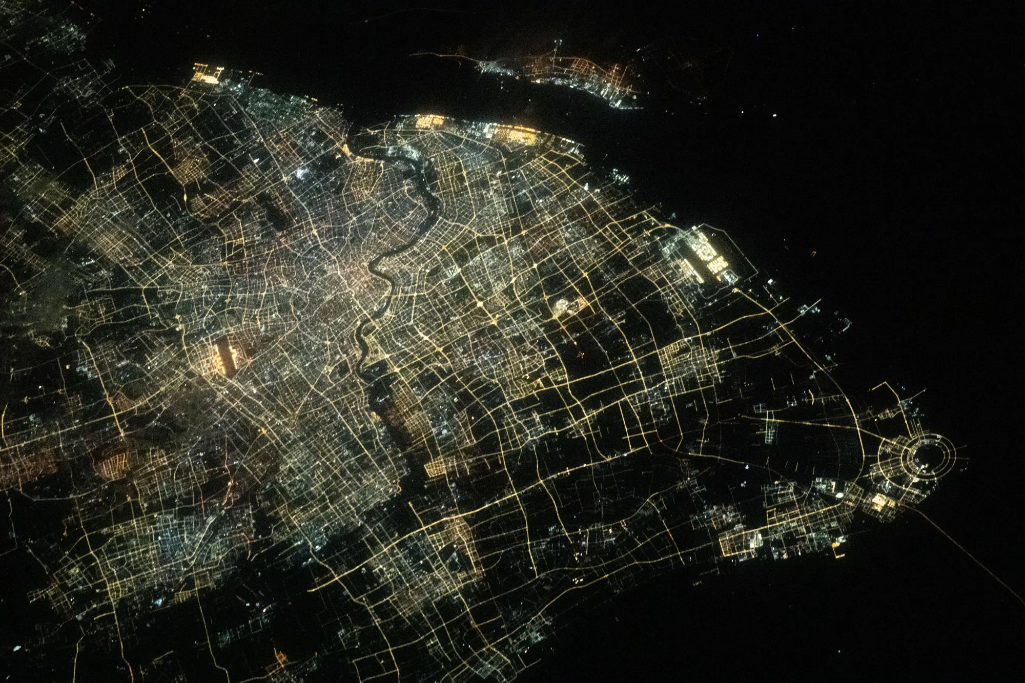从距离地球260英里的国际空间站俯瞰上海夜景。城市的灯光照亮道路;周围一片漆黑。...