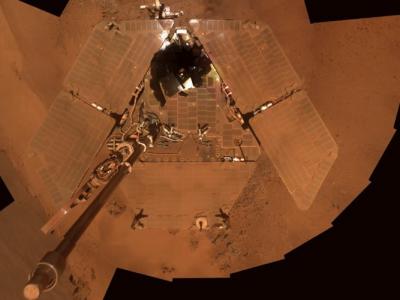 机遇号的太阳能板铺满沙尘。火星受沙尘暴吹袭,红圈为机遇号位...