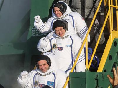 载有三名国际空间站宇航员的联盟“MS-07”飞船返回舱在哈萨克...