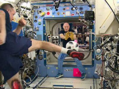 二人所踢的足球(蓝圈示)为世界杯的官方足球。宇航员在无重状...