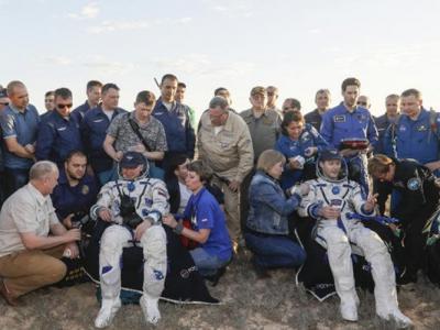 诺维斯基(左)及佩斯凯(右)安全着陆。佩斯凯向镜...