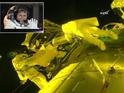 金布罗(左)和惠特森(右)作太空漫步。小图为出发...