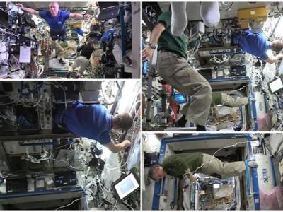 太空人在无重力下大玩定格挑战。太空人在空中漂浮。...