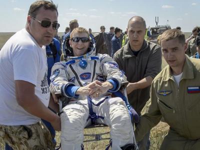皮克(穿太空衣者)著陆后,分享完成旅程的感受。 皮克(左二)早前于哈萨克降...