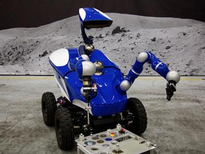 欧空局空间研究与技术中心(ESTEC)内的机器人漫游车“蓝虫”,背景图是灰色的月球...