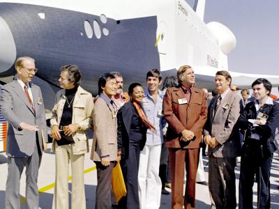 1977年,吉恩·罗登伯里(右三)和他的《星际迷航》剧组成员参加航天飞机企业号的首次...