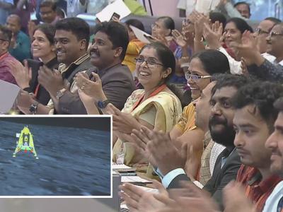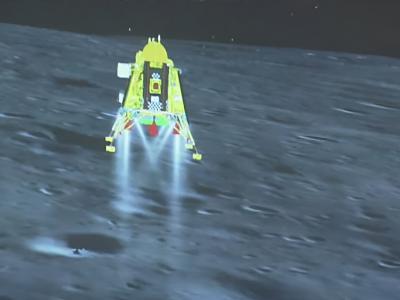 印度空间研究组织(ISRO)的现场直播显示,月船3号飞船在月球南极成功着陆前几秒钟。...