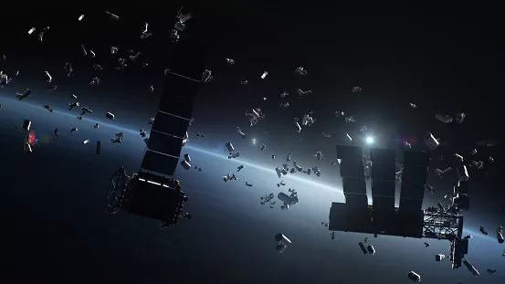 一幅散落在低地球轨道上的太空垃圾的渲染图,描绘了一个似乎是空间站的虚构的毁灭。...