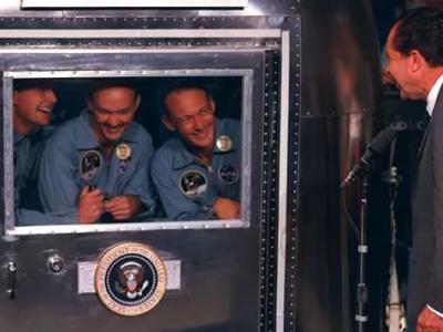 1969年返回月球后,三名阿波罗11号宇航员在隔离设施中与理查德·尼克松总统交谈。理...