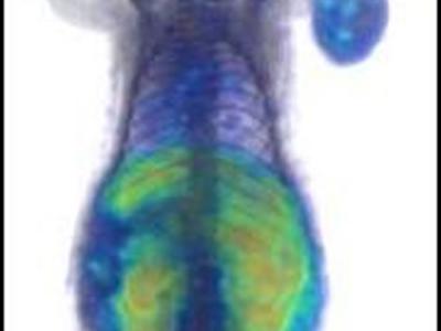放射性标记的蛋白质照亮了植入小鼠手臂的肿瘤, 在 PET 扫描下...
