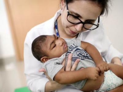 孕妇受寨卡病毒感染,孩子出生时未必一看便知有健康问题。图为巴西女医生为一名小...