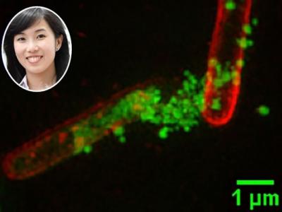 林舒(小图)的团队研发的星形蛋白(绿),可以撕裂超级细菌(红)的细胞壁,从而...