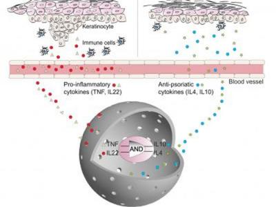 基于AND门特异性细胞因子转换器的牛皮癣治疗示意图。与牛皮癣相关的皮肤炎症是因...