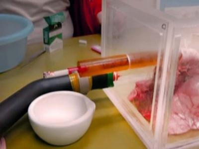 美国研究指现时的香烟较50年前更有害。图为科学家以猪肺测试香烟成份对肺部的祸害...