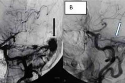 61岁男性患者行右枕部硬脑膜动静脉瘘手术前(A)和10年后(B)的血管造影。白箭头...