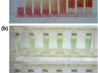 格林地沟油以不同比例掺入合格绿宝大豆油后检测效果图,百分数表示地沟油在合格大...