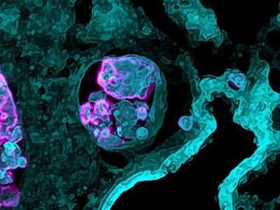 这是一阻塞肺动脉的组织切片的荧光视图 研究人员设计了一种会模仿血小板行为并特...