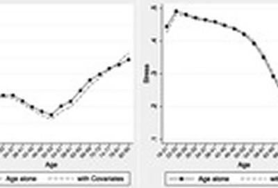 综合幸福感在50岁后增加(左),而压力则下降。 再也不用担心是不是有工作,再也...