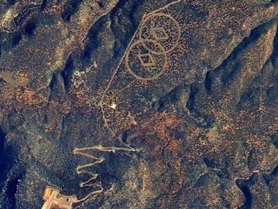 卫星图像显示新墨西哥州蜿蜒道路通向环形叠加钻石图案结构,一位山达基教发言人证...
