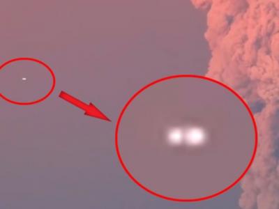 卡尔布科火山喷出大量火山灰,旁边疑似出现UFO踪影(红圈示)。 疑似UFO(红圈...