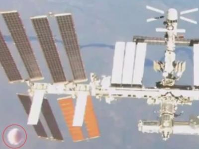 一个银白色的圆形不明飞行物体(红圈示),在国际太空站附近出现。 有网民猜测是...