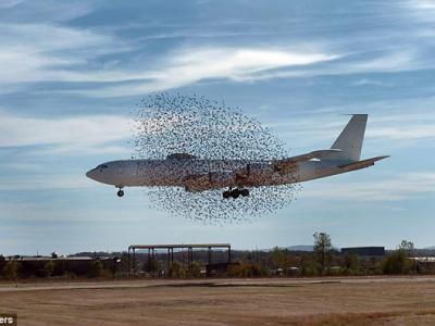 美国海军飞机被鸟群袭击 鸟类已经在飞机场附近盘旋,忽然它们成组聚成一个球并...
