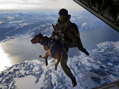 挪威特种兵携嗅探犬一万英尺高空跳伞