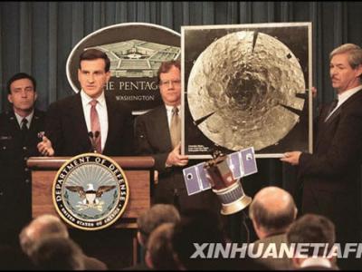 图为1996年12月3日,诺泽特(右二)在五角大楼出席新闻发布会时站在一幅由“克莱...