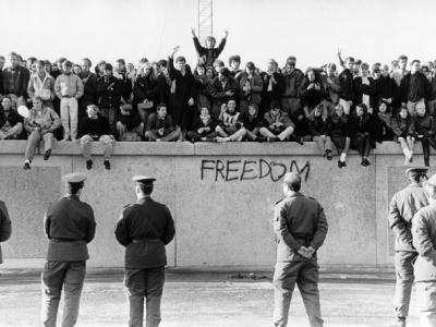 在柏林围墙倒下的1989年11月,西德民众在东德卫兵面前爬上了这道冷战藩篱。 PHOTOG...
