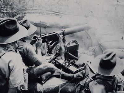 守军士兵以防空机枪射击空中目标。澳洲士兵观察空中...