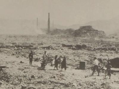原爆后,有不少伤者在缓慢移动。 地上片瓦无全。 建筑物化成碎片。 伤者...