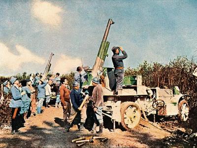 图为身着蓝色军服,头戴钢盔的士兵,目不转睛地盯着天空,随时准备拦截空中目标 ...