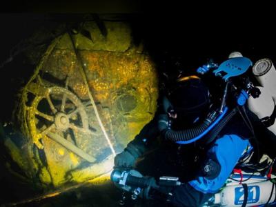 潜水员在卡尔斯鲁厄号巡洋舰内进行搜索。沉没的军舰内发现残留的瓷器。巡洋舰的内部...
