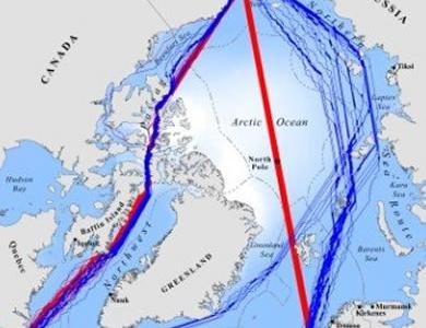 图中的红线表示大西洋与太平洋之间的快速捷径航线 研究人员发现北极可打通一条意...