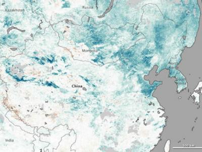 上面这幅地图是根据NASA的Terra卫星的观测数据绘制的,显示了2013年1月1-8日中国...