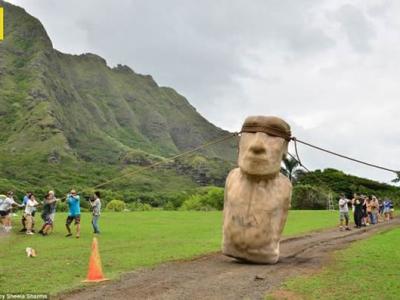 夏威夷,3组志愿者拉动复活节岛巨石像复制品,让巨石像发生摇摆,一点点向前挪动...